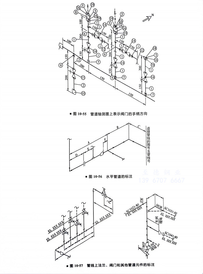 ⑥. 閥門的手柄方向應表示在軸測圖(tu)上(圖(tu)10-55)。
