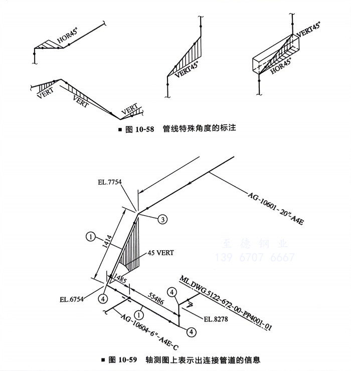 c. 管(guan)線的(de)特殊角度(非(fei)正(zheng)南、正(zheng)北、正(zheng)東、正(zheng)西、正(zheng)上(shang)、正(zheng)下(xia)的(de)情(qing)況)應該表示在(zai)軸測圖上(shang)(圖10-58)。