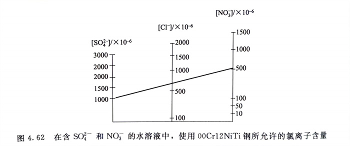 圖4.61系00Cr12NiTi鋼在不同氯(lv)化(hua)物含量條(tiao)件下(+350mV,SCE)鋼的(de)(de)臨界點(dian)蝕溫度;而(er)圖4.62則系在含 和 的(de)(de)水溶液(ye)中,所(suo)允許(xu)的(de)(de)最高氯(lv)離子含量。